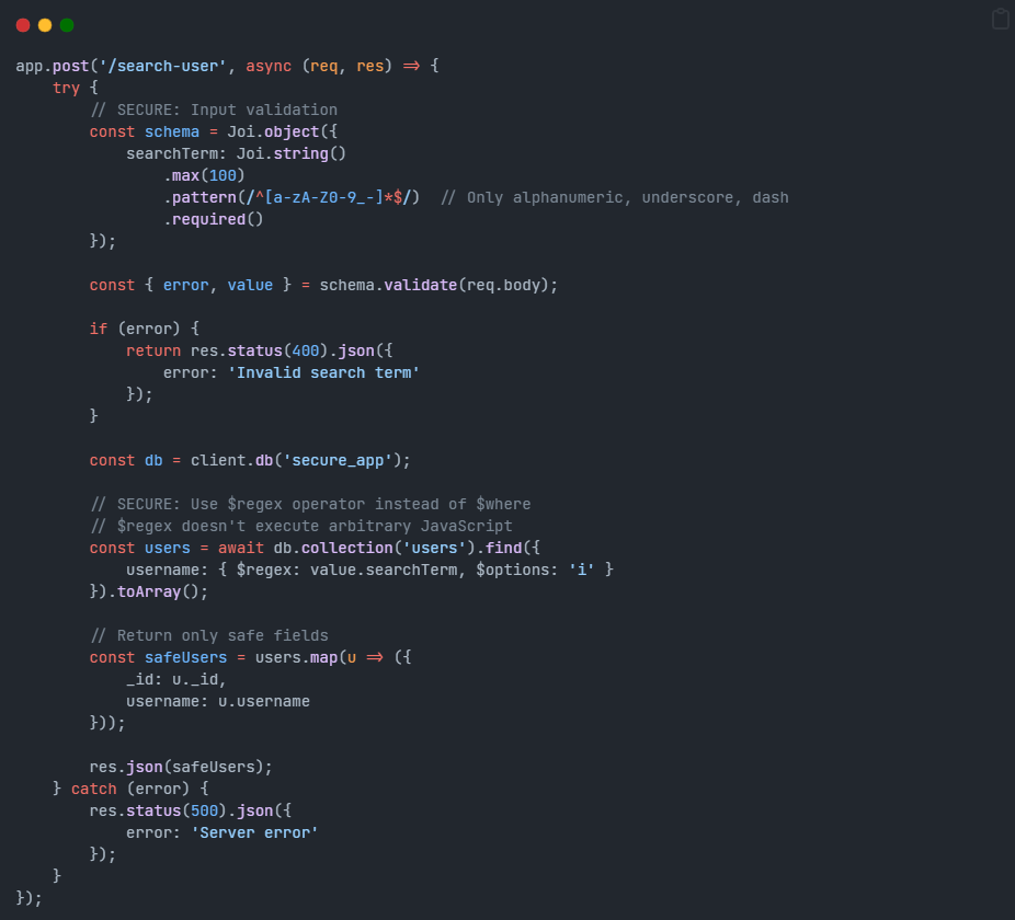$regexinstead, which doesn’t execute arbitrary code - Strict pattern validation – only alphanumeric characters allowed in search terms