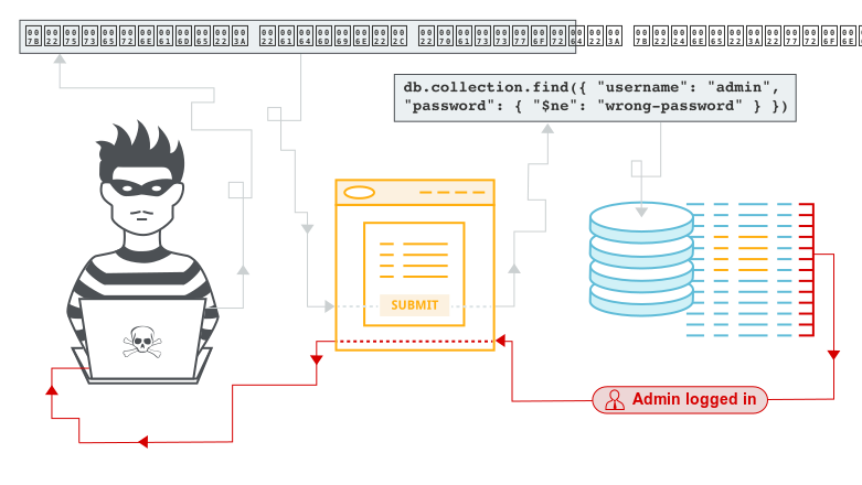 db.users.findOne({email: {$ne: ""}}) // Matches all documents where email field existsThis flexibility enables subtle injection attacks where type mismatches create unexpected matches.