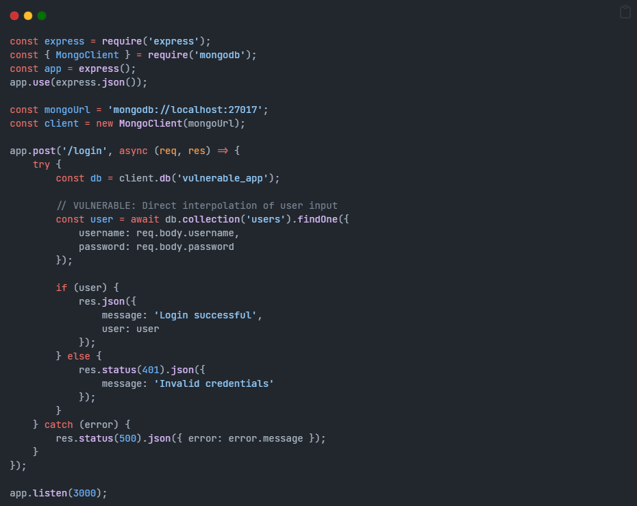 const user = await db.users.findOne(req.body);If req.body is {username: {"$ne": null}}, the JavaScript runtime naturally creates an object with nested structure. The developer’s code never explicitly recognizes this as an injection—they simply passed a valid object to the database driver.