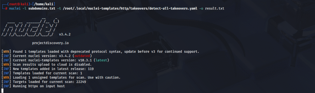 nuclei -l subdomains.txt -t /nuclei-templates/http/takeovers/detect-all-takeovers.yaml -o results.txt